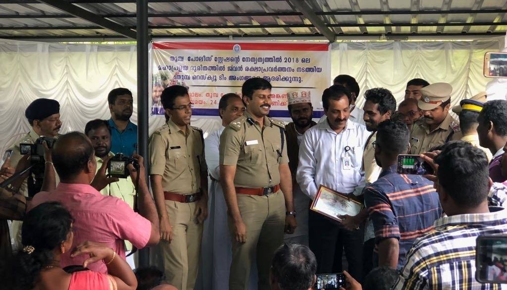 പ്രളയദുരന്തത്തിലകപ്പെട്ട ആയിരക്കണക്കിനാളുകളെ സ്വജീവൻ തൃണവൽഗണിച്ച്, വള്ളത്തിലെത്തി രക്ഷിച്ച തീരദേശ മത്സ്യതൊഴിലാളി വീരന്മാരെ തുമ്പ പോലീസ് സ്റ്റേഷന്റെ നേതൃത്വത്തിൽ ആദരിച്ചു. രക്ഷാപ്രവർത്തകരായി പോയ 57 മത്സ്യത്തൊഴിലാളികൾ , വള്ളങ്ങൾ കൊണ്ട് പോകാൻ സഹായിച്ച ലോറി ഡ്രൈവേഴ്സ്, സി എസ് എഫ് ജവാൻസ്, രക്ഷാ പ്രവർത്തനത്തിൽ സഹായിച്ച പോലീസ് ഉദ്യോഗസ്ഥർ എന്നിവരെ പ്രശസ്തി പത്രവും പൊന്നാടയും ഓണക്കോടിയും നൽകി ആദരിച്ചു. കഴക്കൂട്ടം എ സി പി ശ്രീ. അനിൽകുമാർ അധ്യക്ഷനായിരുന്ന ചടങ്ങ് സിറ്റി പോലീസ് കമ്മീഷണർ ശ്രീ പി പ്രകാശ് IPS ഉത്ഘാടനം ചെയ്തു. ഐ എസ് ആർ ഒ ഡയറക്ടർ ശ്രീ എസ് സോമനാഥ് ചടങ്ങിൽ മുഖ്യാതിഥി ആയിരുന്നു.
