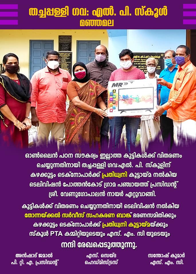 സർക്കാർ സ്കൂളുകളിൽ കുട്ടികളെ പഠിപ്പിക്കുന്ന ടെക്കികളുടെ കൂട്ടായ്മയായ 'പ്രതിധ്വനി മൈ ഗവണ്മെന്റ് സ്കൂൾ' ന്റെ നേതൃത്വത്തിലാണ് TV നൽകുന്നത്. ബിനീഷ് നാഗൂർഖനി, ഹാഷിം, ജോഷി എ കെ, അജിത് അനിരുദ്ധൻ, മുഹമ്മദ് അനീഷ്, ജോഫിൻ, ശ്യാഗിൻ എന്നിവരുടെ നേതൃത്വത്തിലായിരുന്നു വിതരണം.