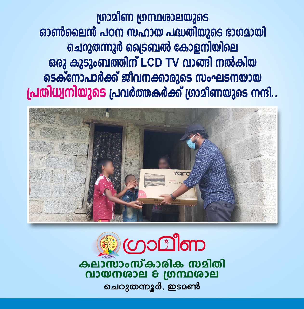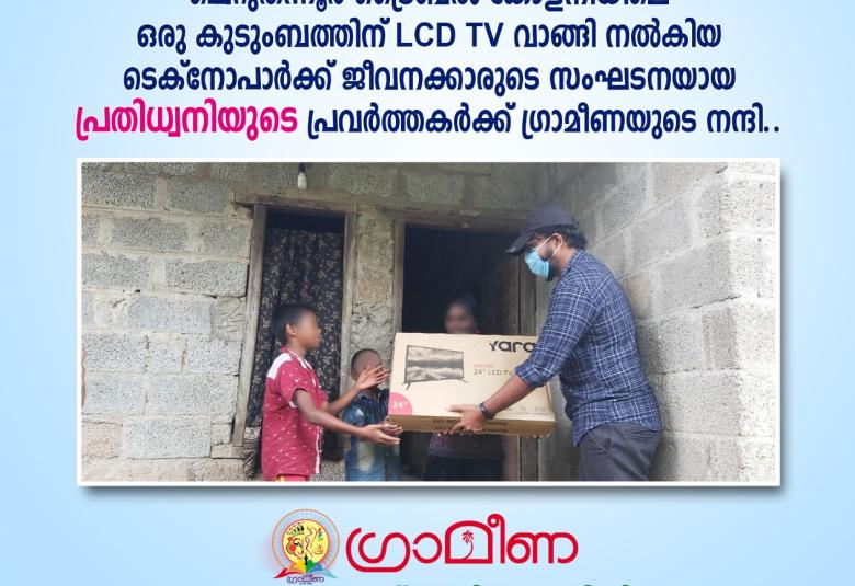 തിധ്വനിയുടെ ഫസ്റ്റ് ബെൽ ചലഞ്ചിന്റെ ഭാഗമായി ലഭിച്ച 8 TV കൾ കുട്ടികൾക്ക് ഓൺലൈൻ പഠനത്തിനായി കഴിഞ്ഞ ദിവസങ്ങളിൽ വിതരണം ചെയ്തു. കഴിഞ്ഞ ദിവസം 2 TV കൾ ചെറുവത്തൂർ ട്രൈബൽ കോളനിയിലും കണിയാപുരത്തും ആണ് വിതരണം ചെയ്തത്.