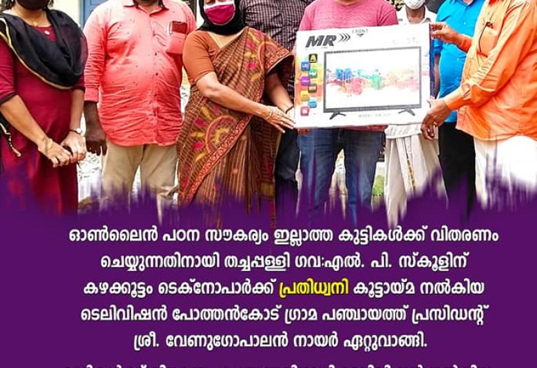 സർക്കാർ സ്കൂളുകളിൽ കുട്ടികളെ പഠിപ്പിക്കുന്ന ടെക്കികളുടെ കൂട്ടായ്മയായ 'പ്രതിധ്വനി മൈ ഗവണ്മെന്റ് സ്കൂൾ' ന്റെ നേതൃത്വത്തിലാണ് TV നൽകിയത്. വിനീത് ചന്ദ്രൻ, എ കെ ജോഷി, ബിനീഷ് നാഗൂർ ഖനി, റോഷൻ, സതീഷ് കുമാർ, ജോൺസൻ, ബിമൽ രാജ്, രാജീവ് കൃഷ്ണൻ, വിഷ്ണു രാജേന്ദ്രൻ, അരുൺ കേശവൻ, അജിത് അനിരുദ്ധൻ എന്നിവരുടെ നേതൃത്വത്തിലായിരുന്നു വിതരണം.