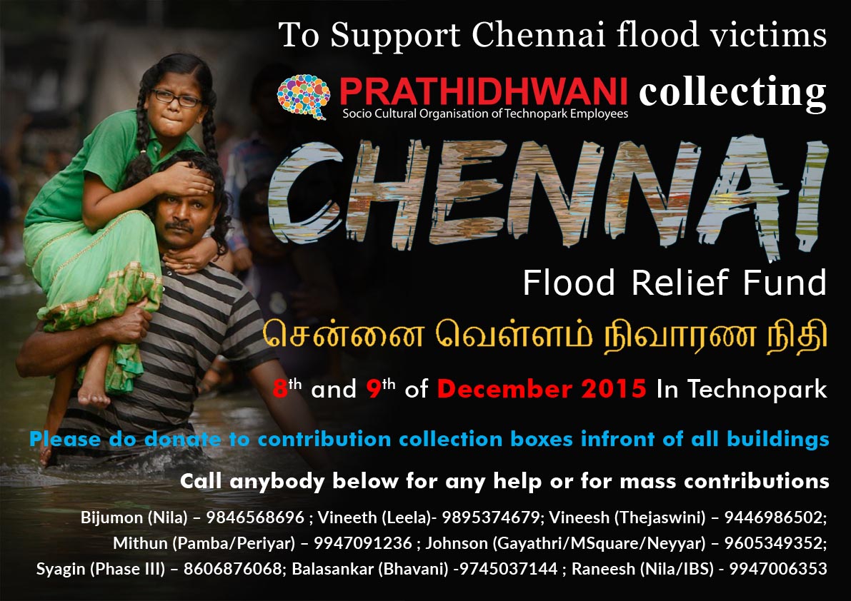 Prathidhwani collecting “Chennai Flood Relief Fund” @ Technopark on 8th & 9th December 2015 As we are all aware from various communication medium , there has been a frightening flood situation in Chennai. Normal human life is disrupted and now the focus is on rehabilitation. Life has been tough and now Chennai needs to fight against epidemics and bring back life to normalcy. We, Socio-Cultural Organisation of Technopark Employees - Prathidhwani are committed to render our help at this hour of need.