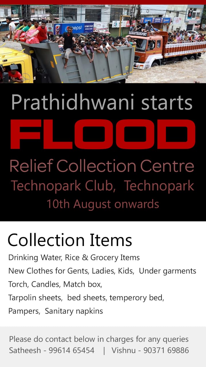 Prathidhwani is starting Flood Relief Collection Center in Technopark @Technopark Club from August 10. The collected items will be distributed to flood affected regions with the help of Trivandrum District Administration and Thiruvananthapuram Corporation.