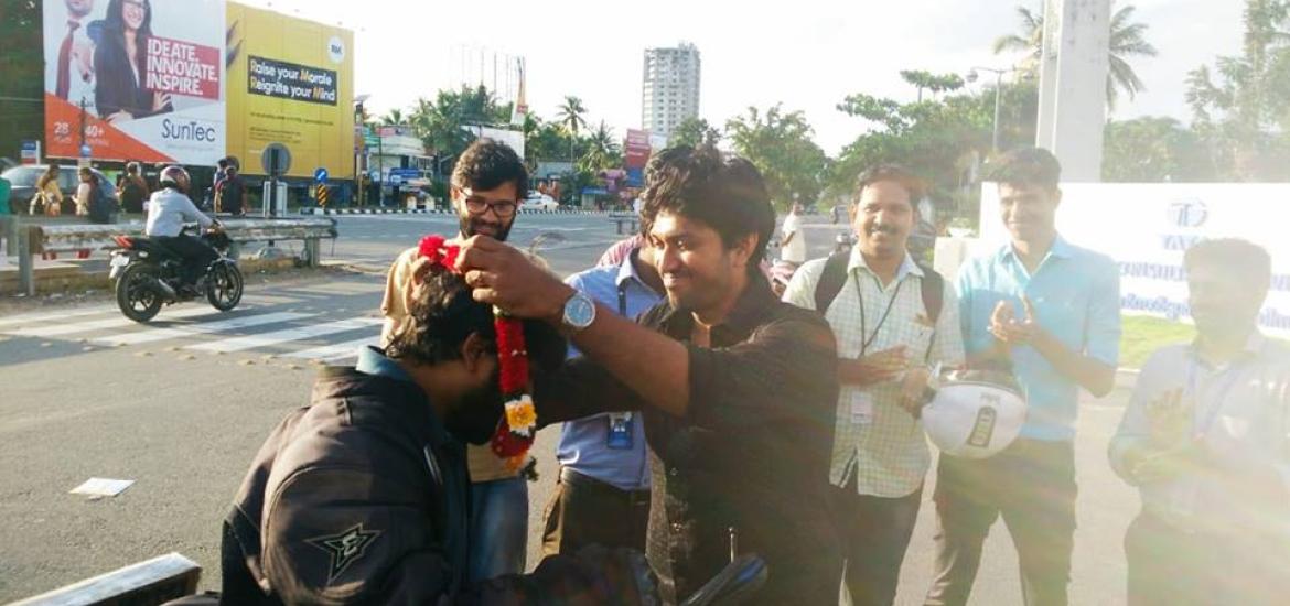 Prathidhwani executive member Akhil S A received Martin Jose at front gate of Technopark when he came back here. Martin has covered 2500kms in five days and passed the "Support Kerala" message in three neibouring states.