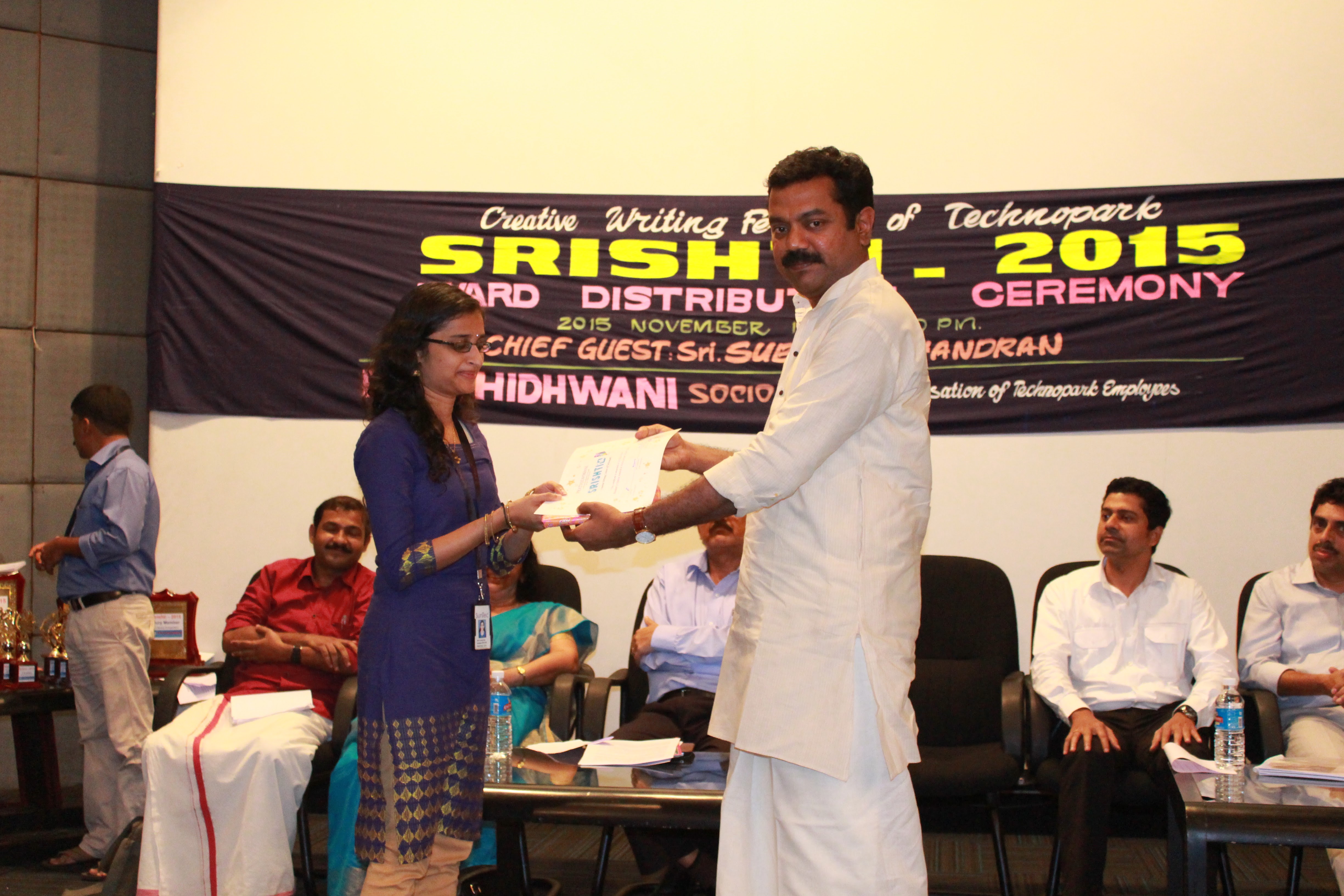 Awards were distributed by the eminent and one of the most read young writers in contemporary Malayalam literature, Sri, Subash Chandran on 16th of November 2015 at Travancore hall in Technopark. The event which spanned around 2 months, invited entries in Essay/Short Stories/Poetry in both English/Malayalam. In his inaugural speech, Sri. Subash Chandran stated that in a generation where the word, ‘Culture’ is fanciful, words are taking a new turn, where the words are coined which were once considered as contradictory. He quoted the examples of goons and ethics are now coined together to form moral policing and that bookfairs are now common place. He also voiced his concerns that in the birth place of one of the world renowned visionary, Sree Narayana Guru, where it is expected that for atleast a 1000 years his principles of unity and harmony should sustain, is now in a very nonsecular and unstable state. He also expressed that it is the youth and the writers who should be among the first to object and direct the nation to the right direction. The President of Prathidhwani, Bijumon presided over the function, whereas the jury Chair Person, Smt. Chandramathi teacher felicitated over the function. She told that the common misconception of techies outside Technopark is that they only work with their brains and not with their heart and that the events like Srishti has proven it otherwise. She also expressed her happiness on the immensity of the thoughts and impeccable awareness of the topics of the contestants who participated in Srishti. Renowned English poet and Jury member, Sri, Gopi Kottur said that it was a very difficult task to assess the entries as every entry was of extraordinary quality and specially mentioned about the craftsmanship of the authors. Sri. Vinod Vellayani, another jury member, said that poetry is not just an pastime, but a strong and wonderful visage of art. He also said that in difficult times, it is the responsibility of all artists to express his thoughts and protests in various forms of art. Sri. Suresh Kottur, Jury member of Sristhi 2015, communicated that the root to an artist is his desire to tell the society in his own voice. Technopark Business Development officer, Sri. Basanth extended all support and encouraged Prathidhwani to move forward with more initiatives like this. He also said that Technopark is fortunate to have an employee forum like Prathidhwani. Srishti 2015 Convener, Bimal Raj said the welcome speech and Prathidhwani Secretary, Rajeev expressed the vote of thanks. Special Thanks to Mr.Tom J Mangattu (Indulekha Media Network), SFS, KADA.in, Palnaar Solutions & Standout Solutions for supporting Prathidhwani for Srishti 2015.